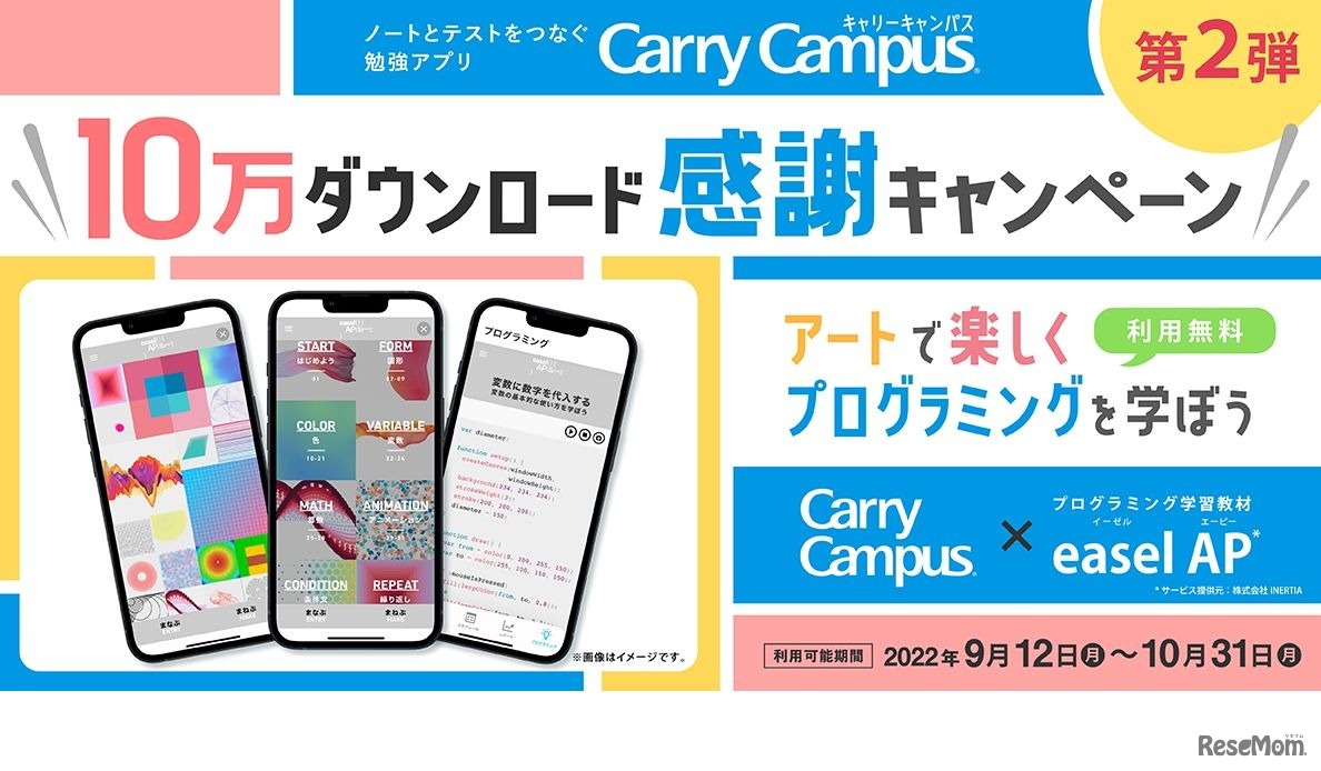 INERTIAは、コクヨが運営する勉強アプリ「Carry Campus」の累計10万ダウンロードを記念し、2022年9月12日~10月31日までの間、同アプリ利用者全員にオンラインプログラミング教材「easel AP」を無料で提供する。