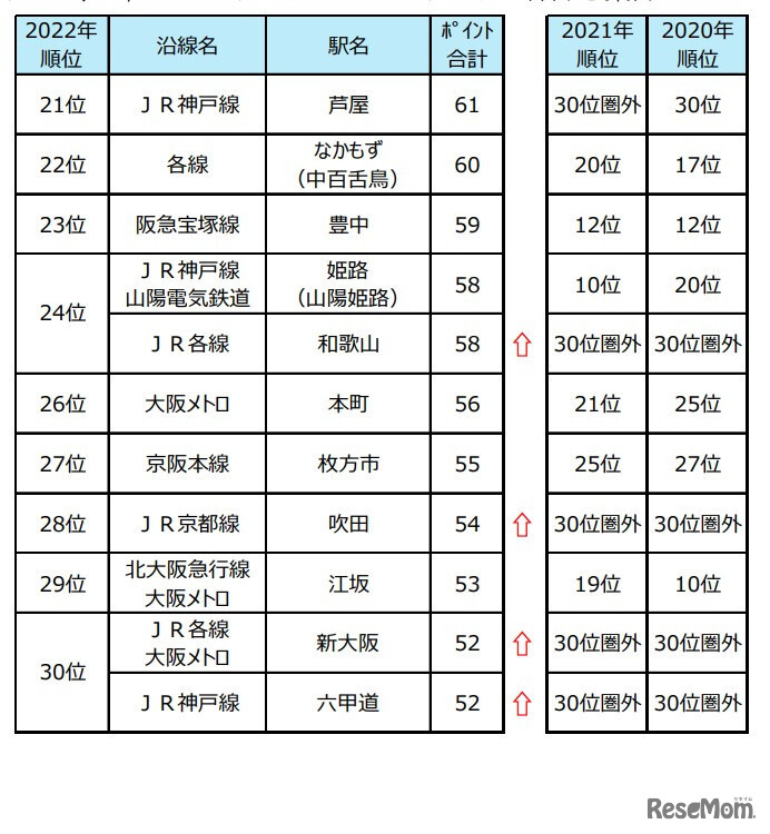長谷工アーベストは2022年9月16日、近畿圏総合「住みたい街(駅)ランキング2022」を発表した。TOP2は9年連続で、第1位「西宮北口」、第2位「大阪・梅田」が選ばれ、2021年調査で5位の「三宮」が第3位にランクアップした。
