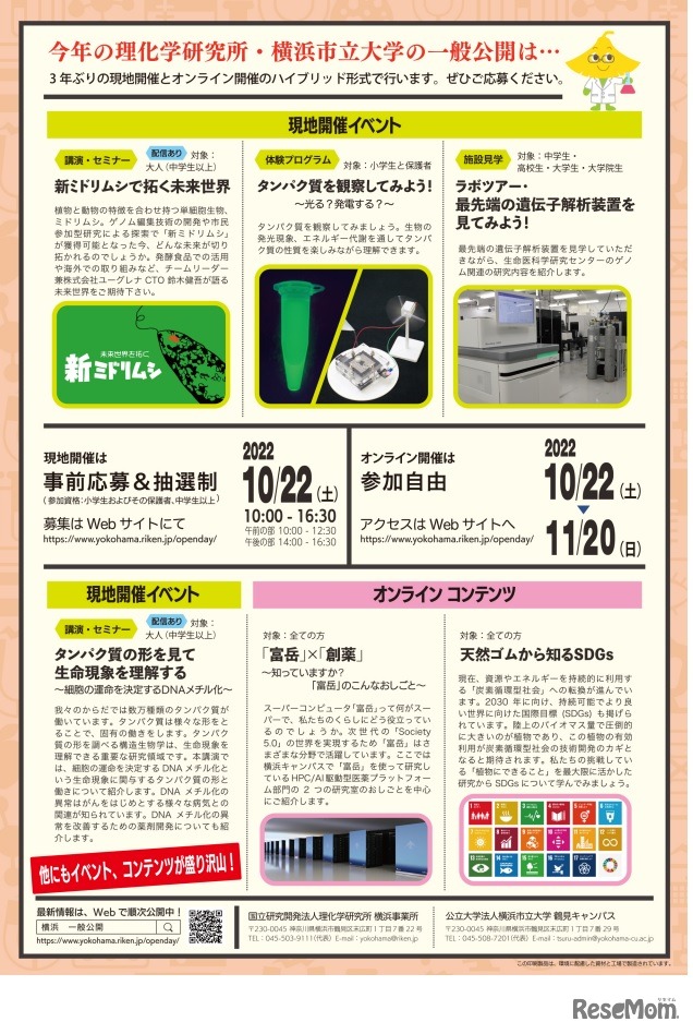 理化学研究所横浜キャンパスと横浜市立大学鶴見キャンパスは、一般公開「あした咲く花 みつけよう!~未来のたね~」を2022年10月22日キャンパス内の現地で、10月22日から11月20日までオンラインで開催する。現地開催は事前応募、抽選制。