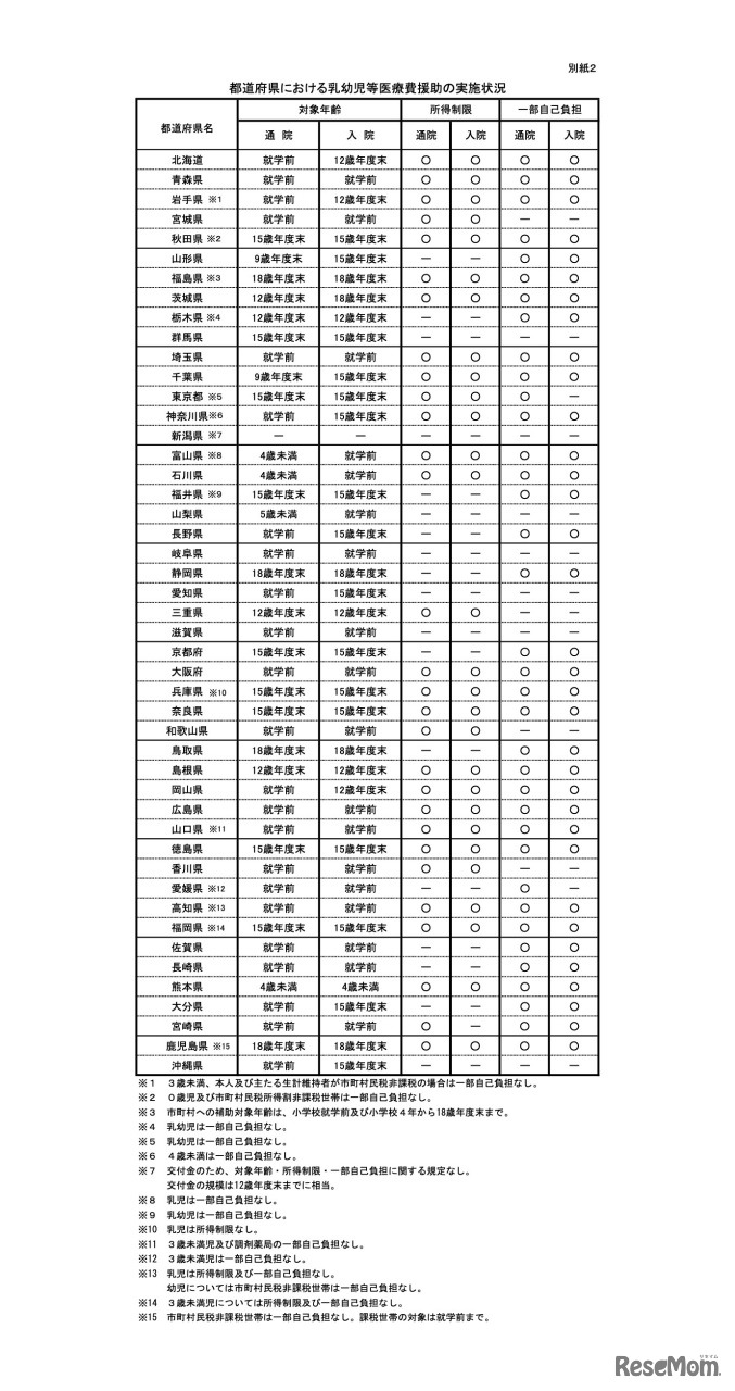 厚生労働省は2022年9月16日、2021年度「乳幼児等に係る医療費の援助についての調査」の結果を公表。医療費の援助は、すべての都道府県・市区町村が実施しており、対象年齢は都道府県では「就学前まで」、市区町村では通院が「中学生まで」、入院が「高校生まで」が最多。