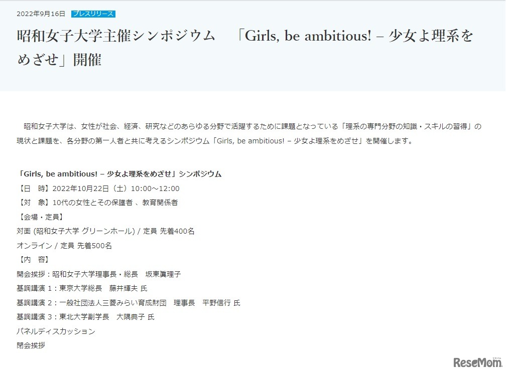昭和女子大学は2022年10月22日、10代の女性とその保護者、教育関係者向けにシンポジウム「Girls, be ambitious!―少女よ理系をめざせ」を昭和女子大学とオンラインで開催する。対面は定員400名。オンラインは定員500名。10月17日まで先着順で受付。