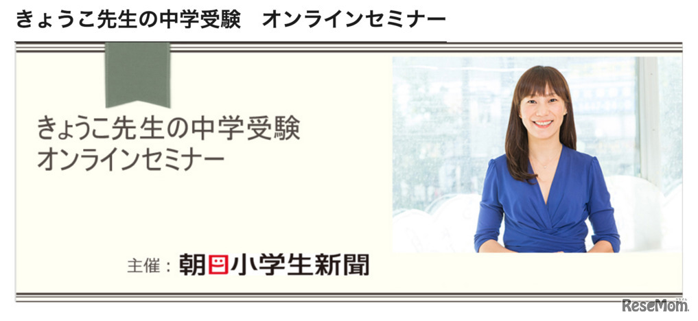 朝日小学生新聞は「きょうこ先生の中学受験 オンラインセミナー」を2022年10月23日に開催する。内容は小学6年生の保護者向けだが、他学年の保護者も参加可能。