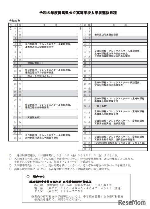 2023年度群馬県公立高等学校入学者選抜日程
