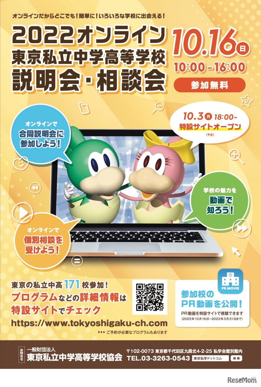 東京私立中学高等学校協会は2022年10月16日、「2022オンライン東京私立中学高等学校説明会・相談会」を開催する。東京の私立中学校・高等学校171校がオンラインでの個別相談やライブ配信での学校説明会等を実施する。参加無料、予約不要(一部事前予約プログラムあり)。