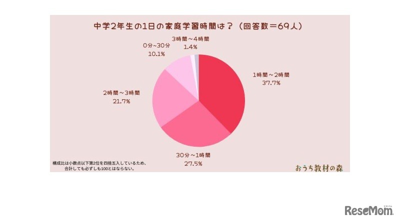 ARINAが運営する幼児、小学生の保護者向け教育メディア「おうち教材の森」は、日本全国の中学生の子供をもつ保護者を対象としたアンケート調査「中学生の1日の家庭学習時間は?」を実施。2022年9月15日に結果を公表した。