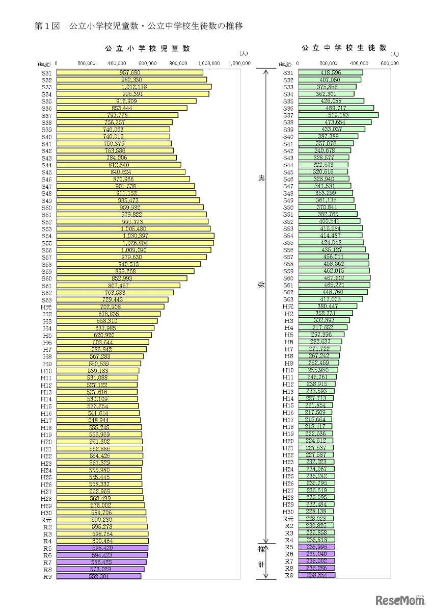 東京都教育委員会は2022年9月22日、同年度の教育人口等推計(速報値)の概要を公表した。5年後の2027年度には2022年度実数と比較して、公立小学校児童は4万8,163人減の55万2,301人、公立中学校生徒は1,836人増の23万8,654人になると見込まれている。