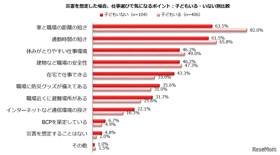 仕事と家庭の両立を希望する主婦・主夫層の実情や本音を探る調査機関「しゅふJOB総研」は、「災害と仕事選び」をテーマに仕事と家庭の両立を希望する主婦・主夫層にアンケート調査を実施し、子供がいる人といない人の傾向について追加分析を行った。
