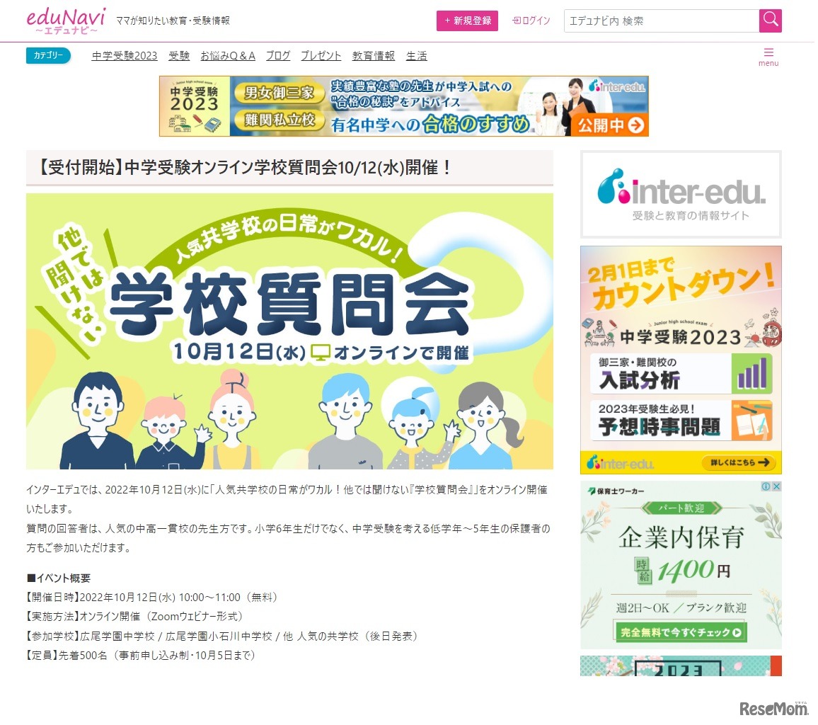 受験教育情報サイトインターエデュ・ドットコムは2022年10月12日、小学6年生や中学受験を考える小学生の保護者対象に「人気共学校の日常がワカル!他では聞けない『学校質問会』」をオンライン開催する。参加費無料、先着500名。10月5日まで受付。