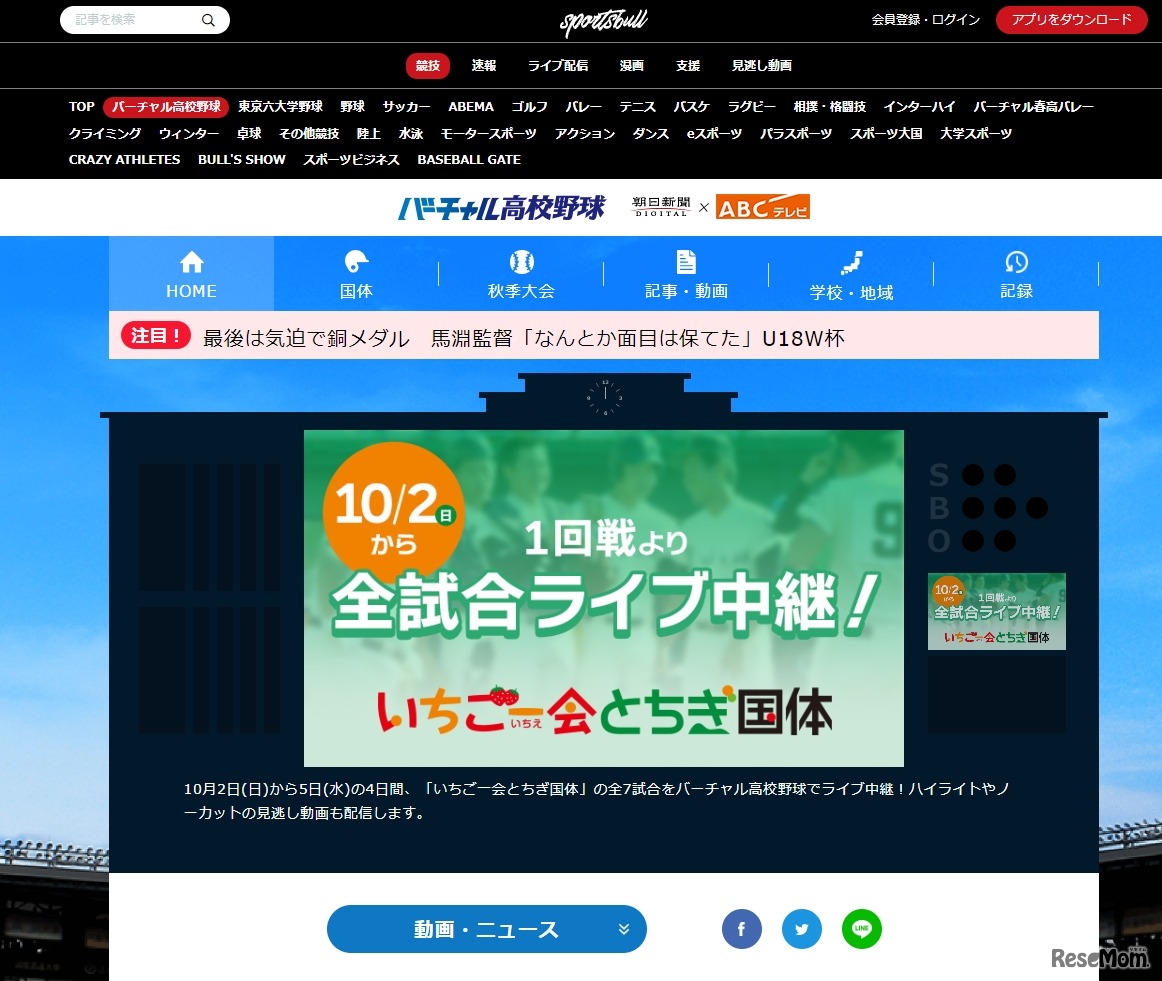 朝日新聞社と朝日放送テレビは、第77回国民体育大会「いちご一会とちぎ国体」の特別競技として2022年10月2日~5日(4日は休養日)に行われる高校野球競技(硬式の部)の全7試合を「バーチャル高校野球」にて無料ライブ配信する。