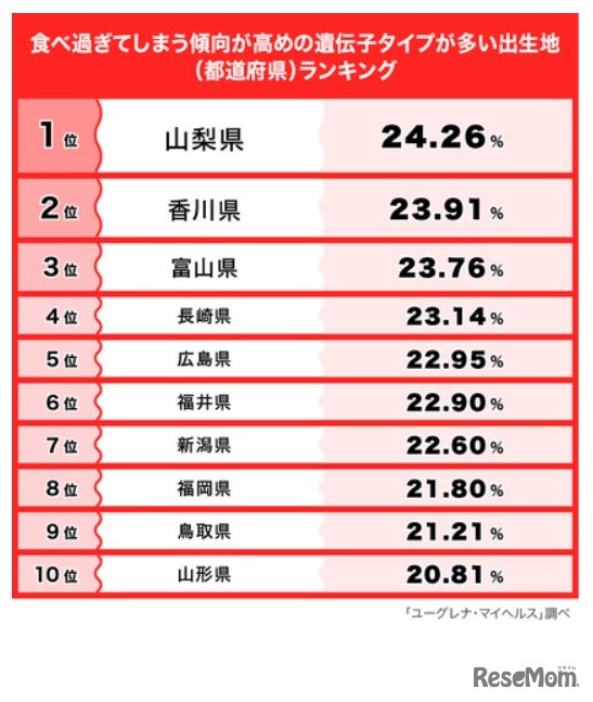 ユーグレナは2022年9月28日、ユーグレナ・マイヘルスとジーンクエストの遺伝子解析サービスのゲノムデータをもとにした「食べ過ぎてしまう傾向が高めの遺伝子タイプが多い出生地(都道府県) ランキング」を公開した。1位は山梨県、2位は香川県、3位は富山県となった。
