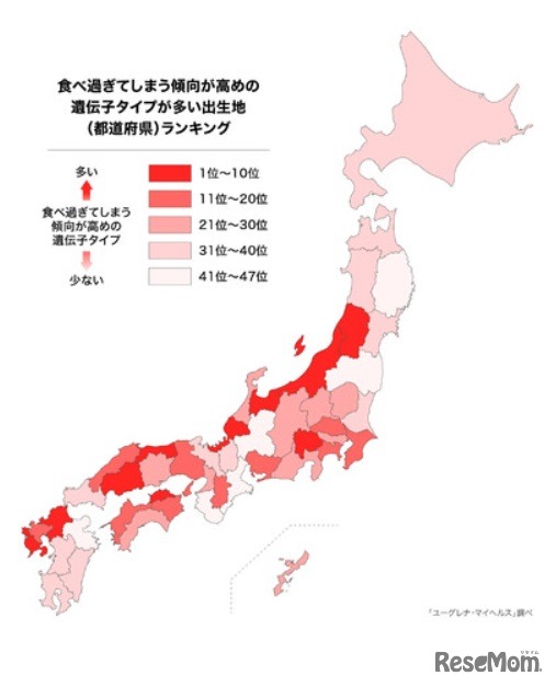 ユーグレナは2022年9月28日、ユーグレナ・マイヘルスとジーンクエストの遺伝子解析サービスのゲノムデータをもとにした「食べ過ぎてしまう傾向が高めの遺伝子タイプが多い出生地(都道府県) ランキング」を公開した。1位は山梨県、2位は香川県、3位は富山県となった。