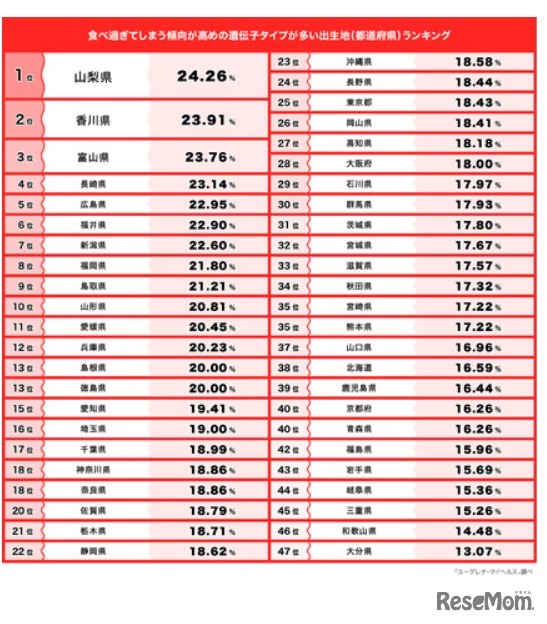 ユーグレナは2022年9月28日、ユーグレナ・マイヘルスとジーンクエストの遺伝子解析サービスのゲノムデータをもとにした「食べ過ぎてしまう傾向が高めの遺伝子タイプが多い出生地(都道府県) ランキング」を公開した。1位は山梨県、2位は香川県、3位は富山県となった。