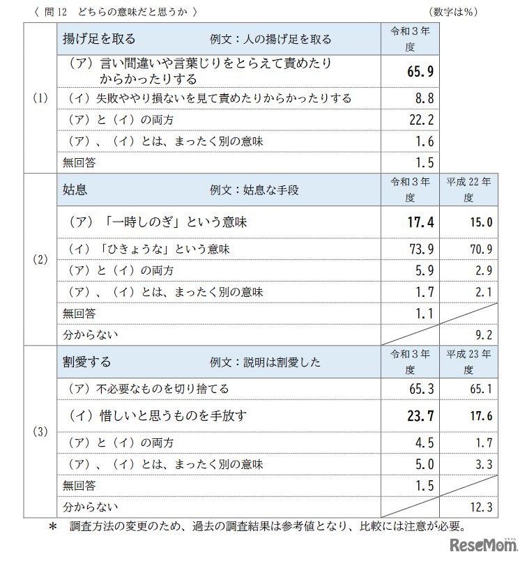 画像出典:文化庁「令和3年度『国語に関する世論調査』の結果の概要」 (ア)と(イ)のどちらの意味だと思うか(本来の意味とされてきたものを太字で表記)