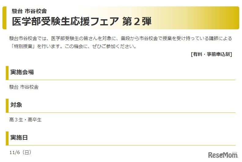 駿台は2022年11月3日・6日に、医学部受験生応援フェアを市谷校舎にて開催する。第1弾は中3生~高卒生・保護者を対象に、無料で医学部入試に関する講演やOBOGトークライブ等、第2弾は高3生・高卒生を対象に私大医系英語・数学の有料授業を行う。