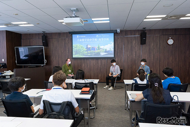 2022年7月に東京で行われた立命館宇治高等学校IBコース説明会のようす。左から、IBコースのマシュー・トーマス先生、卒業生の杉本一陽さん、川岸大記さん