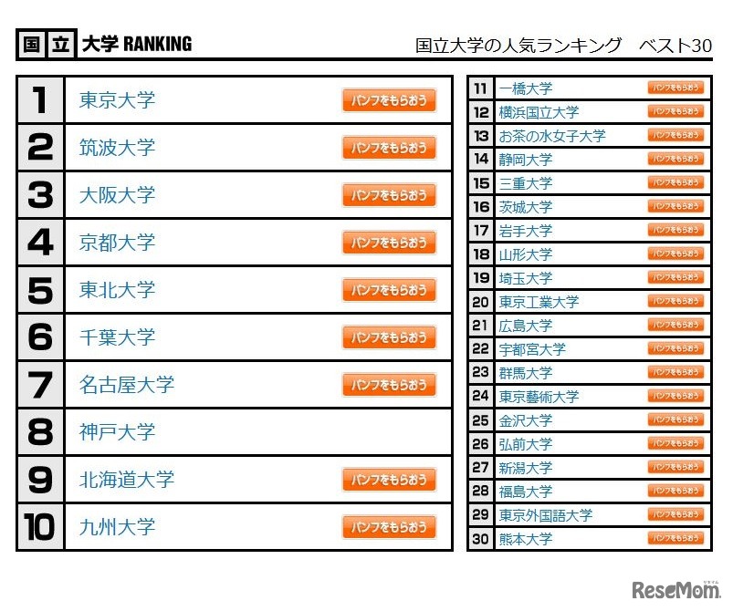 国立大学の人気ランキング ベスト30