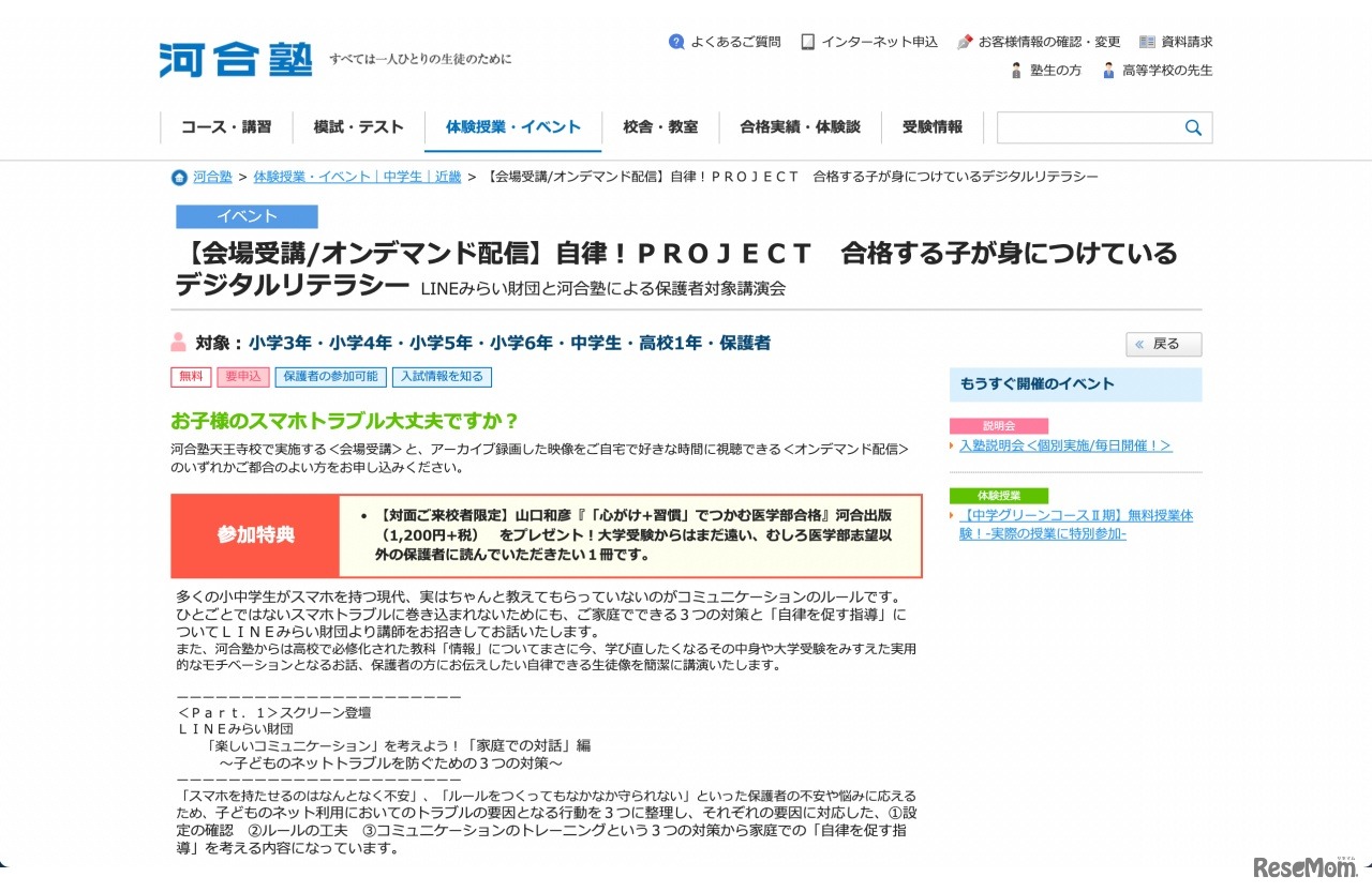 河合塾は2022年10月15日、小学3年生~高校1年生の保護者を対象としたセミナー「自律!PROJECT 合格する子が身につけているデジタルリテラシー」を河合塾天王寺校にて開催。10月25日~11月25日にはアーカイブ録画のオンライン配信を行う。