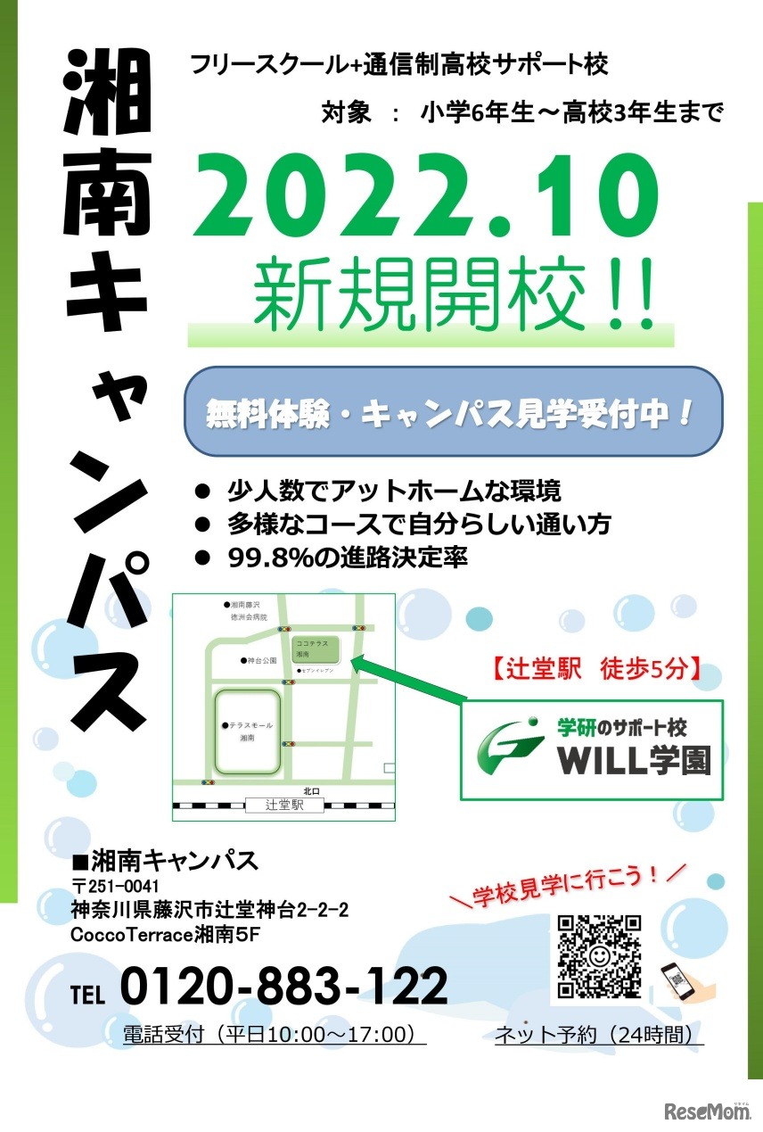 学研ホールディングスのグループ会社、学研エル・スタッフィングは2022年10月、藤沢市のココテラス湘南内に「学研のサポート校WILL学園 湘南キャンパス」を新規開校する。随時個別相談や無料体験を実施している。