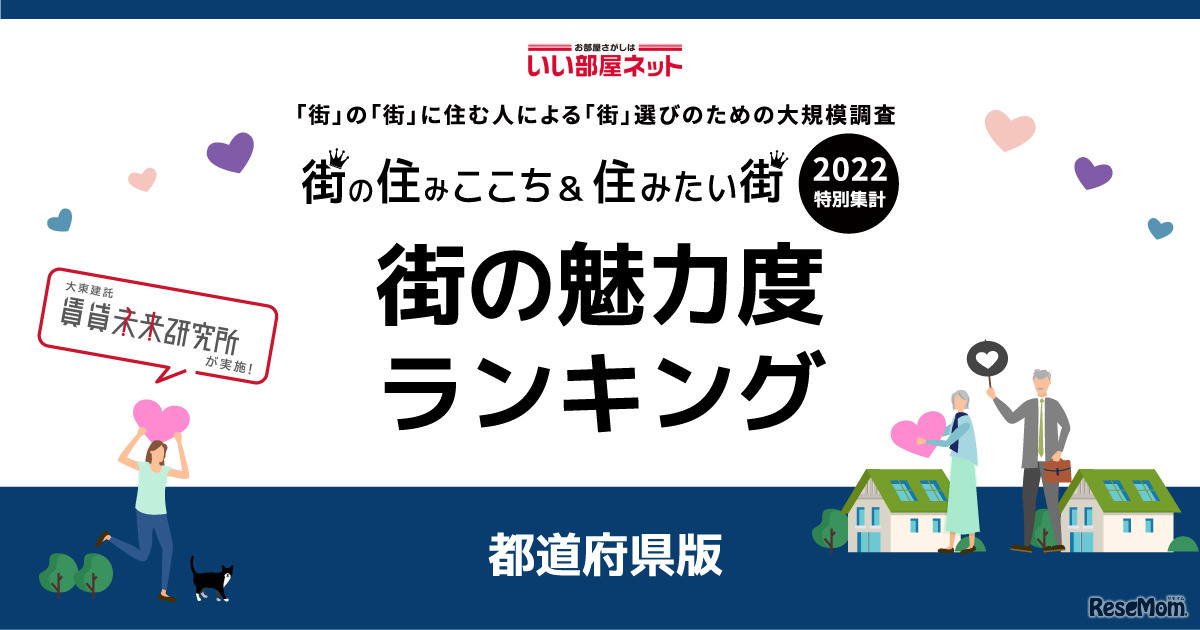 大東建託は2022年10月5日、過去最大級の居住満足度調査をもとにした第1回「いい部屋ネット 街の魅力度ランキング2022<都道府県版>」を発表した。居住者評価の1位は「兵庫県」、非居住者評価の1位は「福岡県」となり、総合1位は「福岡県」となった。
