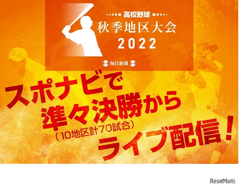 毎日新聞社は、北海道から九州まで全国10地区で争われる「高校野球秋季地区大会2022」で、各地区の準々決勝以上の合計70試合を、ヤフーが運営するスポーツ総合サイト「スポーツナビ」で無料ライブ配信する。ダイジェスト動画・アーカイブ配信も無料。