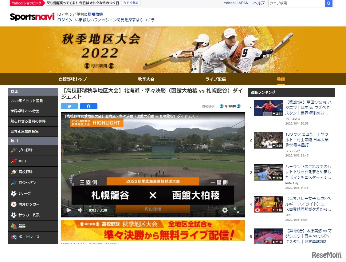 毎日新聞社は、北海道から九州まで全国10地区で争われる「高校野球秋季地区大会2022」で、各地区の準々決勝以上の合計70試合を、ヤフーが運営するスポーツ総合サイト「スポーツナビ」で無料ライブ配信する。ダイジェスト動画・アーカイブ配信も無料。