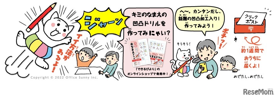 できるびよりは2022年10月1日より、名前練習専用オーダーメイドドリル「凹凸おなまえドリル」の受注を開始した。スマホから注文でき、約1週間で自宅のポストに届く。ドリルの文字の輪郭には凸凹加工があり、はみ出しに気づきながら練習でき、運筆力が育つ。