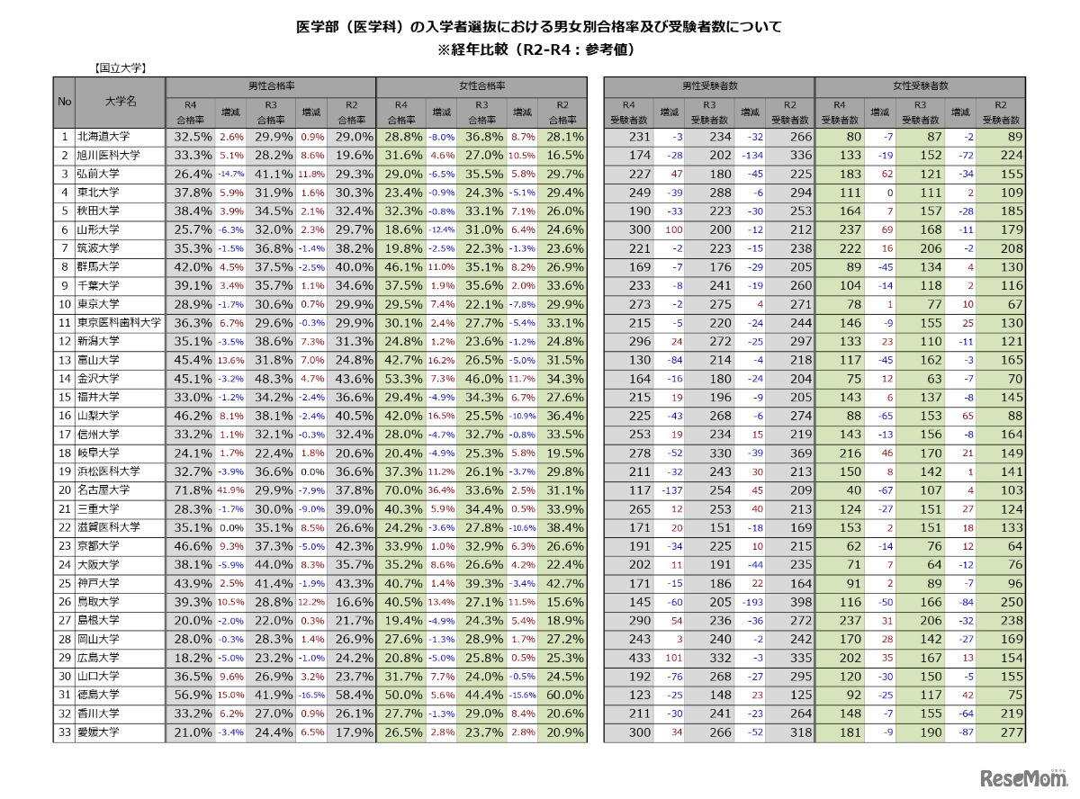 文部科学省は、2022年度(令和4年度)医学部医学科の入学者選抜における男女別合格率の調査結果を公表した。国公私立大学の数値を合計した平均合格率は、男性14.2%が女性13.1%を上回り、女性13.6%が男性13.5%をわずかながらも上回った2021年度の調査結果から逆転した。