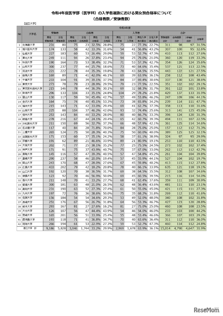 文部科学省は、2022年度(令和4年度)医学部医学科の入学者選抜における男女別合格率の調査結果を公表した。国公私立大学の数値を合計した平均合格率は、男性14.2%が女性13.1%を上回り、女性13.6%が男性13.5%をわずかながらも上回った2021年度の調査結果から逆転した。