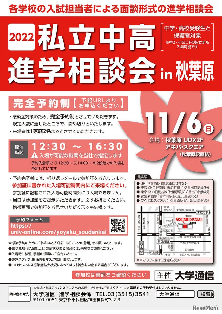 大学通信は、2022年11月6日に中学・高校受験生と保護者を対象とした「2022私立中高進学相談会in秋葉原」をアキバ・スクエアにて開催する。