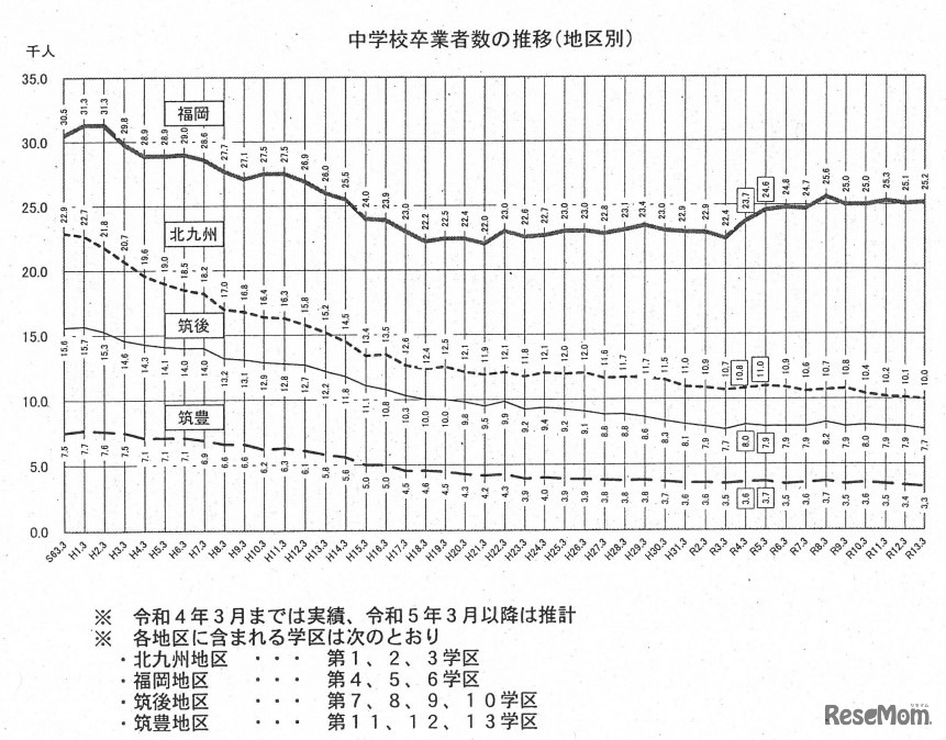 画像出典:福岡県 中学校卒業者数の推移(地区別)