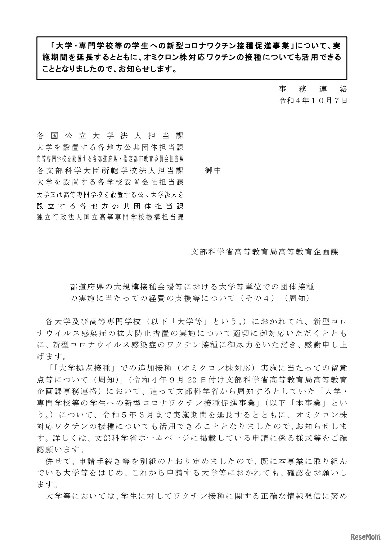 文部科学省は、「大学・専門学校等の学生への新型コロナワクチン接種促進事業」(以下「本事業」)について、実施期間を令和5年3月まで延長するとともに、オミクロン株対応ワクチンの接種にも活用できることとなったことを周知した。