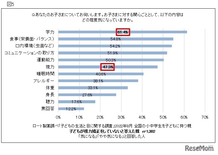 ロート製薬は「子供の生活と目に関する調査」を実施し、結果を公開した。小中学生の約4割が視力矯正しており、6割以上の親が「学力」と同等に子供の「視力」を気にしている。一方で約2割は子供の目を悪くしないための対策を何もしていないことが明らかとなった。