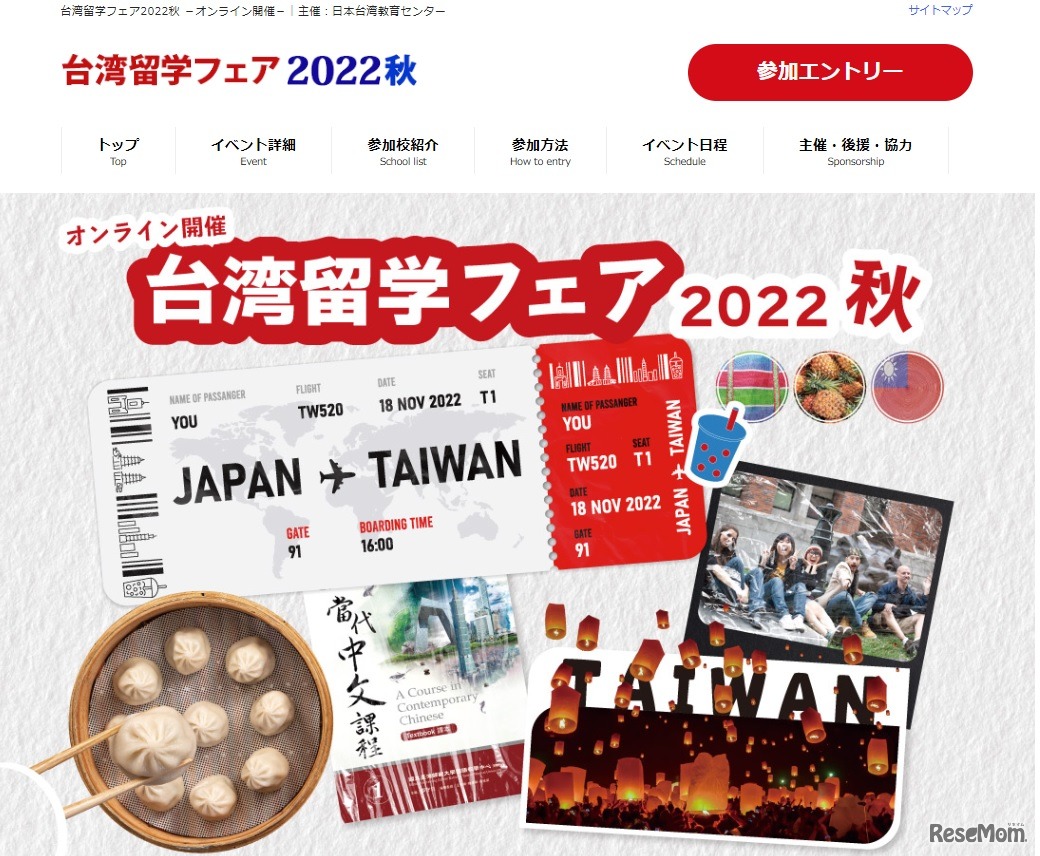 日本台湾教育センターは2022年11月18日から20日まで、台湾留学希望者とその保護者、高校進路指導担当者向けに「台湾留学フェア2022秋」をオンライン開催する。2023年9月入学に向けた国立台湾大学等を含む名門大学25校が参加の大学説明会。参加無料、事前申込制。