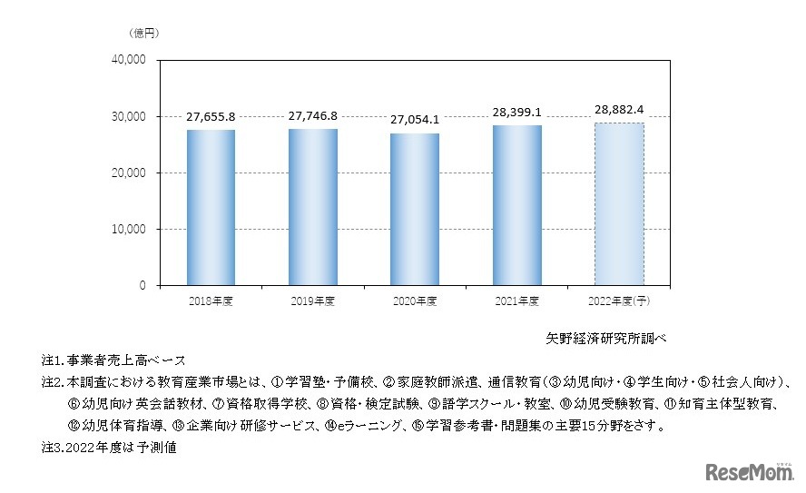 矢野経済研究所は2022年10月11日、教育産業市場に関する調査結果を発表した。主要15分野における国内の教育産業全体の市場規模は、2021年度は2兆8,399億1,000万円。2022年度は2兆8,882億4,000万円と予測され、コロナ禍から回復の兆しをみせている。