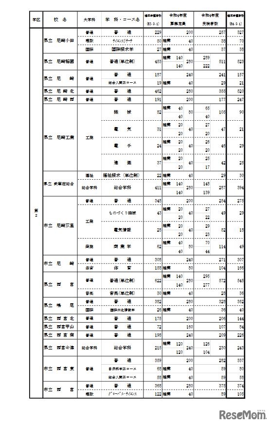 画像出典:兵庫県教育委員会「令和5年度高等学校進学希望者数等調査の結果」 学校別・学科別状況(全日制・第2学区)