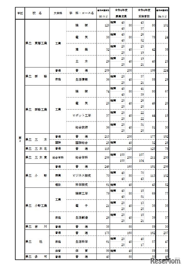 画像出典:兵庫県教育委員会「令和5年度高等学校進学希望者数等調査の結果」 学校別・学科別状況(全日制・第3学区)