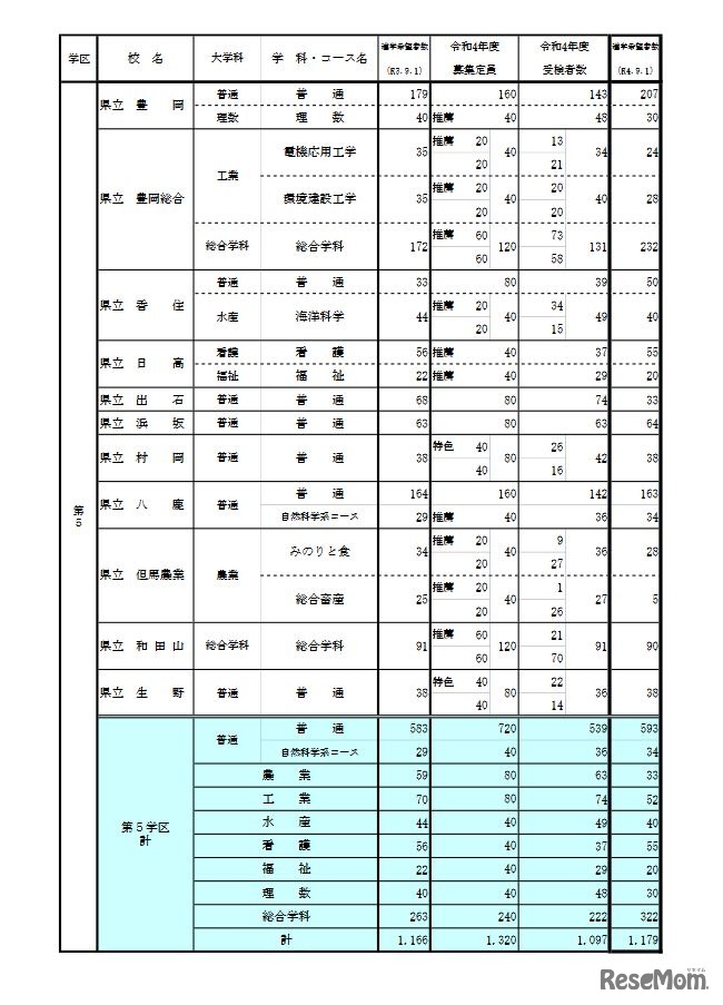 画像出典:兵庫県教育委員会「令和5年度高等学校進学希望者数等調査の結果」 学校別・学科別状況(全日制・第5学区)
