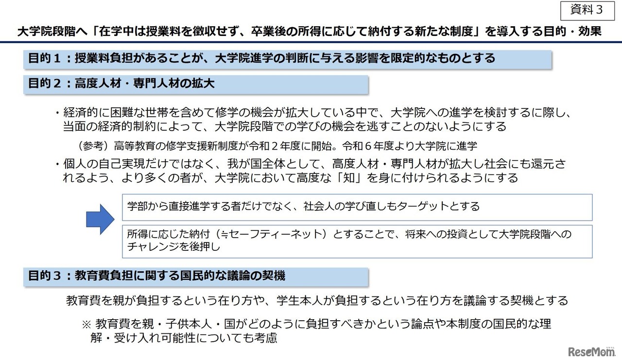 文部科学省は2022年10月12日、有識者会議を開き、卒業後の所得に応じて返済する大学院生向けの新たな出世払い方式の奨学金について、学生等の収入要件、返済を開始する年収水準等の案を示し、基本的な制度設計について協議した。