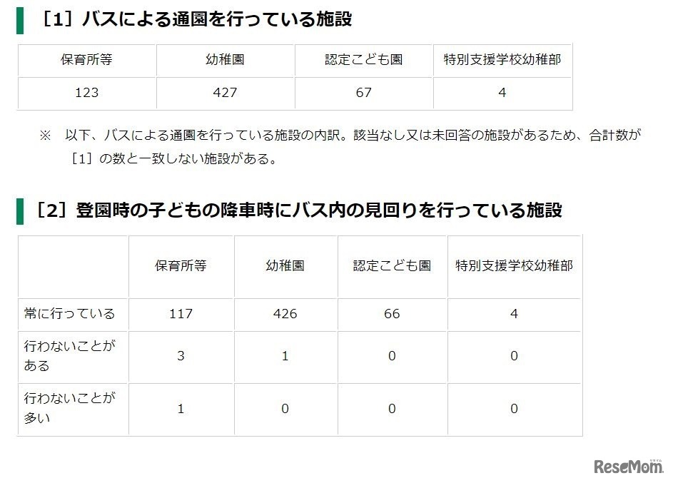 東京都教育委員会は2022年10月12日、幼稚園や保育所等のバス送迎にあたっての安全管理に関する緊急点検の結果を公表した。登園時の子供降車時にバス内の見回りを行っていない施設や、登園していない子供について保護者に連絡をしていない施設が複数あることがわかった。