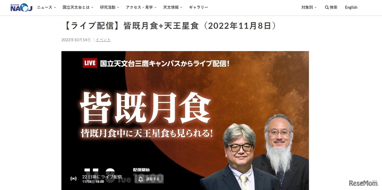 国立天文台は2022年11月8日、東京都・三鷹キャンパスより「皆既月食」をライブ配信し、「天王星食」のようすを望遠鏡で撮影する。ライブ配信は午後6時から午後10時。