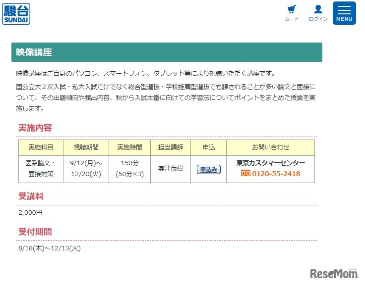 駿台は医学部を目指す受験生を対象に「スーパー医系実戦講座」を2022年10月・11月に開講する。会場は駿台校舎の仙台校・横浜校と特設会場の新潟・長崎・鹿児島。対面講座の他、映像配信による講座(医系論文)も実施している。受講料は1科目2,000円。事前申込制。