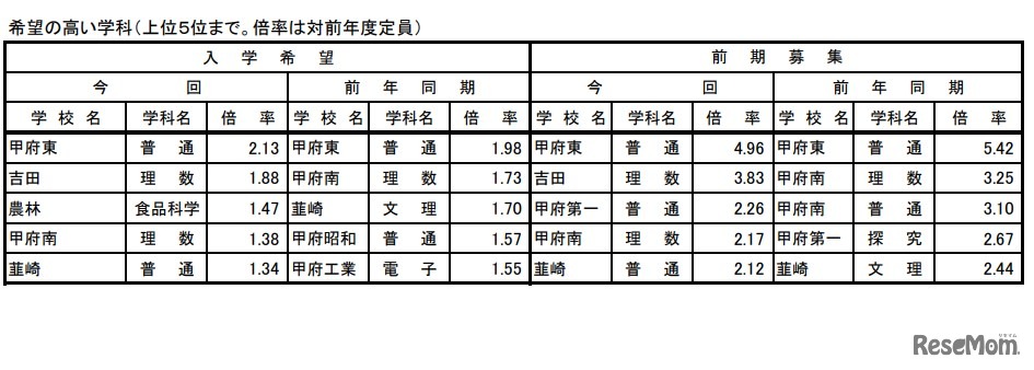 山梨県教育委員会は2022年10月19日、2022年度(令和4年度)中学校卒業予定者の第1次進路希望調査結果の概要を公表した。甲府東(普通)2.13倍がもっとも高く、全日制公立27校の参考倍率は1.03倍と全県1学区制となってから最低となった。