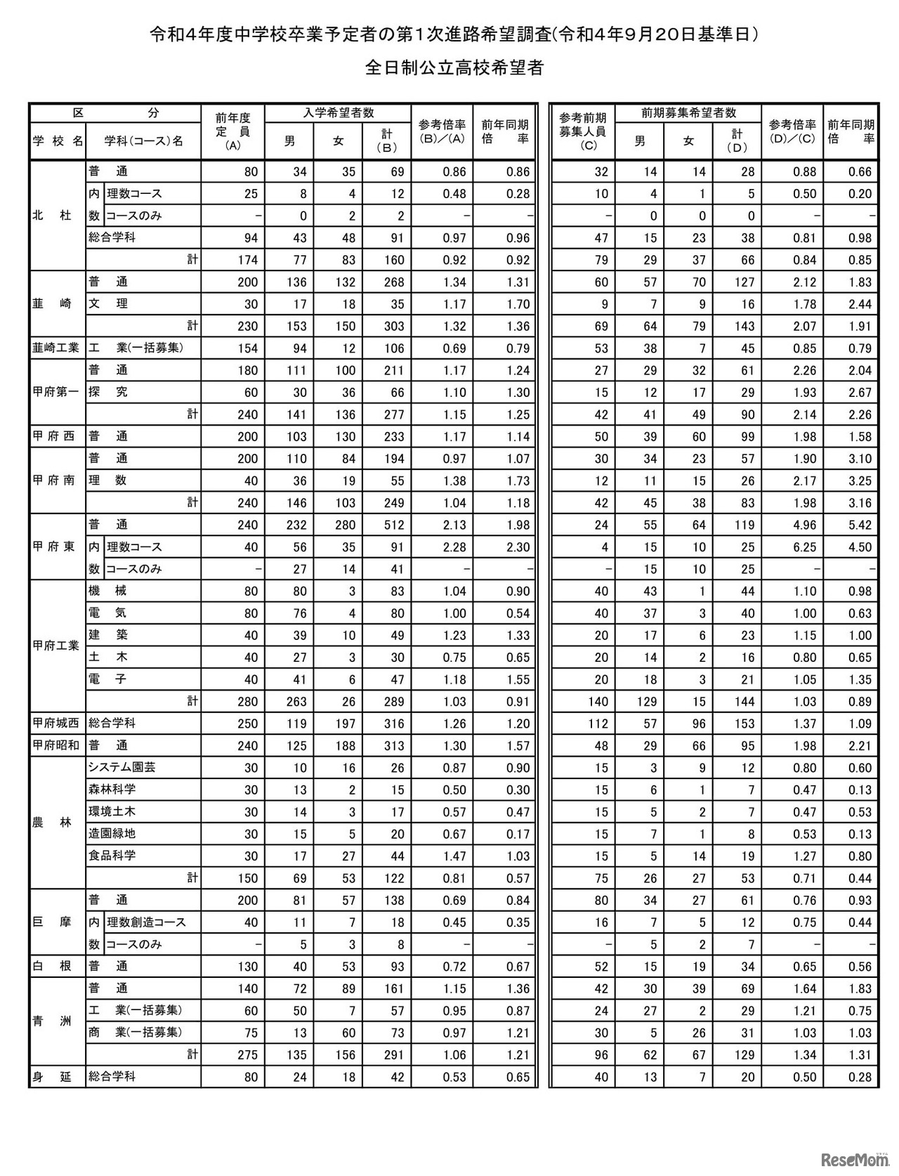 画像出典:山梨県教育委員会 令和4年度中学校卒業予定者の第1次進路希望調査(2022年9月20日基準日)全日制公立高校希望者