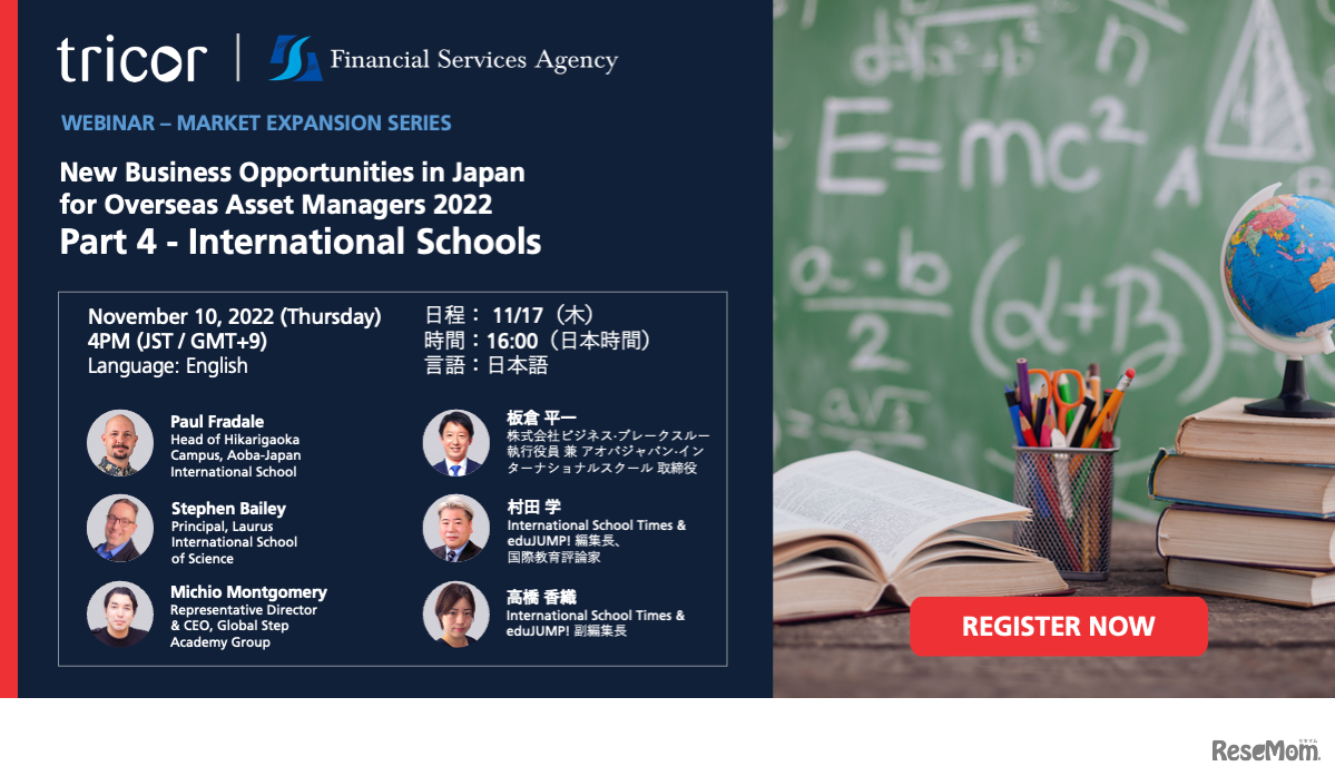 金融庁と企業の海外進出をサポートしているトライコー・ジャパンは、2022年11月10日と11月17日、国内インターナショナルスクールとボーディングスクールを徹底解説するオンラインセミナーを開催する。参加費は無料。要事前申込み。