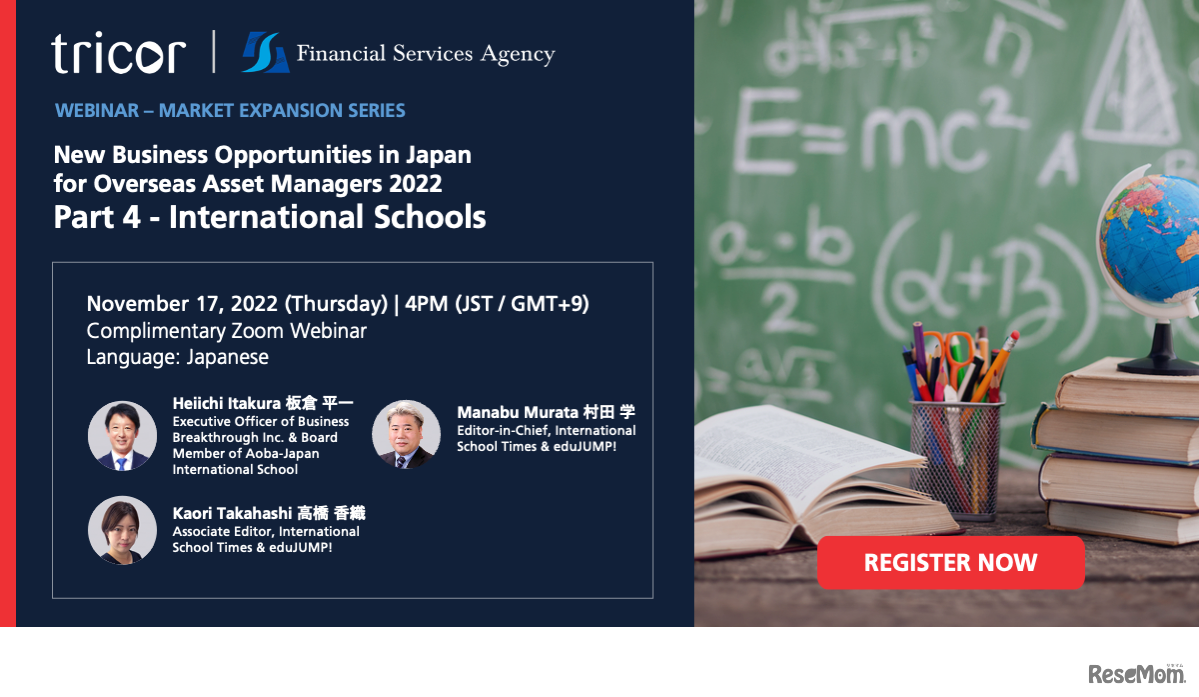 金融庁と企業の海外進出をサポートしているトライコー・ジャパンは、2022年11月10日と11月17日、国内インターナショナルスクールとボーディングスクールを徹底解説するオンラインセミナーを開催する。参加費は無料。要事前申込み。