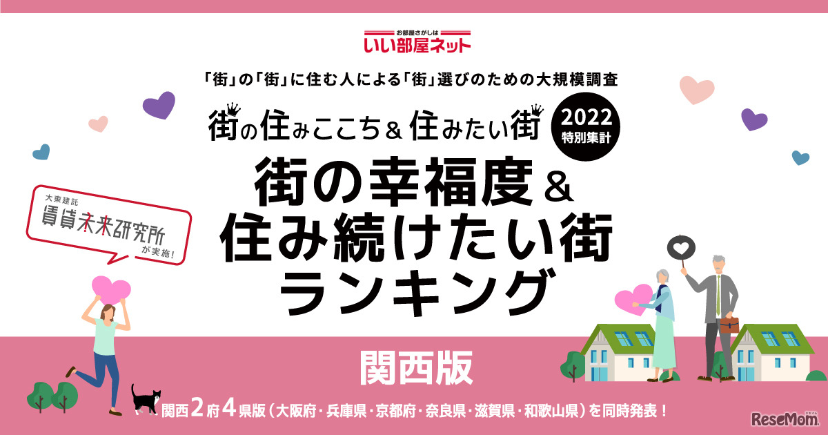 大東建託は2022年10月19日、いい部屋ネット「街の幸福度&住み続けたい街ランキング2022<関西版>」を発表。街の幸福度(自治体)ランキングの1位は「豊能郡豊能町(大阪府)」、街の幸福度(駅)ランキングの1位は「畦野(兵庫県)」となった。