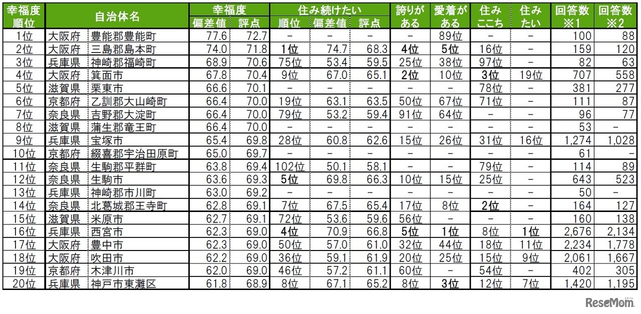 画像出典:大東建託「街の幸福度&住み続けたい街ランキング2022<関西版>」 街の幸福度(自治体)ランキングTOP20