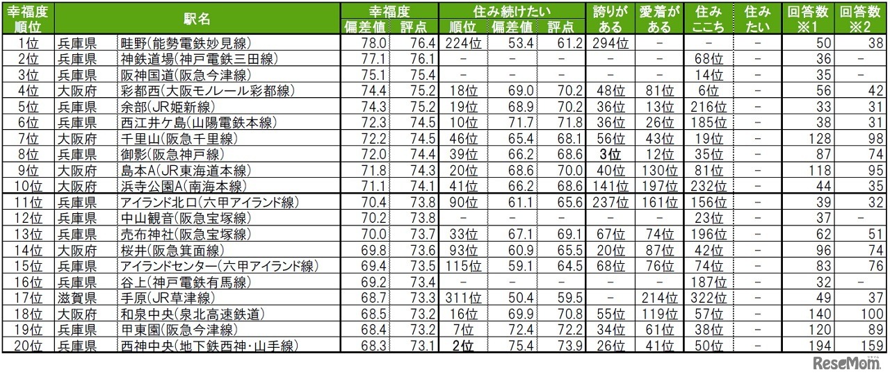 画像出典:大東建託「街の幸福度&住み続けたい街ランキング2022<関西版>」 街の幸福度(駅)ランキングTOP20
