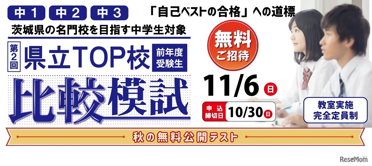 茨城県の市進教育グループ 茨進では、小学生向けに「伸びる力診断テスト」を2022年11月5日・11月6日に開催。中学生向けに「県立TOP校 前年度受験生比較模試」を2022年11月6日に開催する。受験料無料。申込みは2022年10月30日まで。塾生以外の人も受験できる。