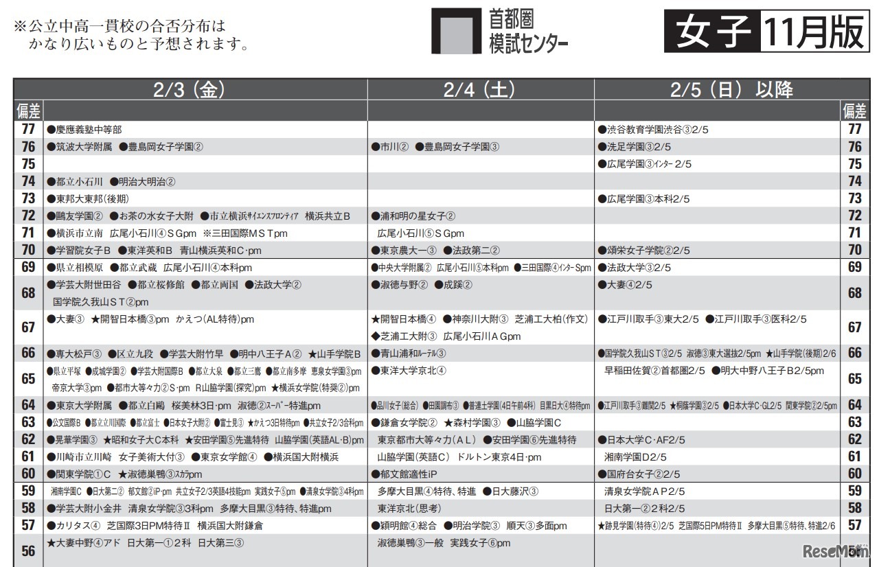 2023年中学入試予想偏差値(女子・2月3日、4日、5日以降)